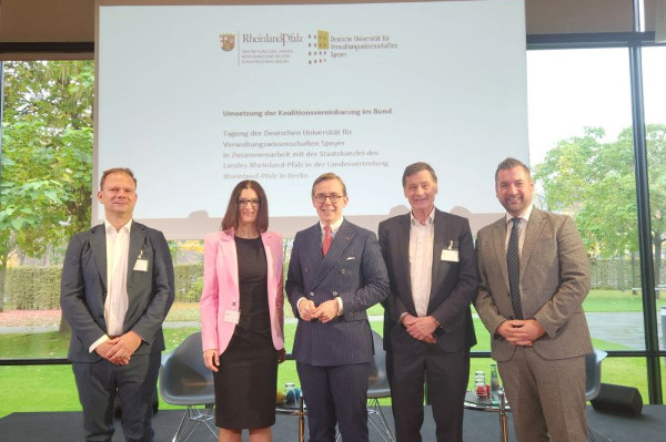 Am 15. Oktober trafen sich in der rheinland-pfälzischen Landesvertretung in Berlin Vertreter aus der Verwaltungspraxis und der Wissenschaft auf Einladung der Staatskanzlei des Landes Rheinland-Pfalz und der DUV Speyer, um über die Umsetzung der Koalitionsvereinbarung im Bund zu diskutieren. Die Univ.-Professores Dres. Sanja Korac, Stephan Grohs und Hermann Hill diskutierten u.a. mit dem
