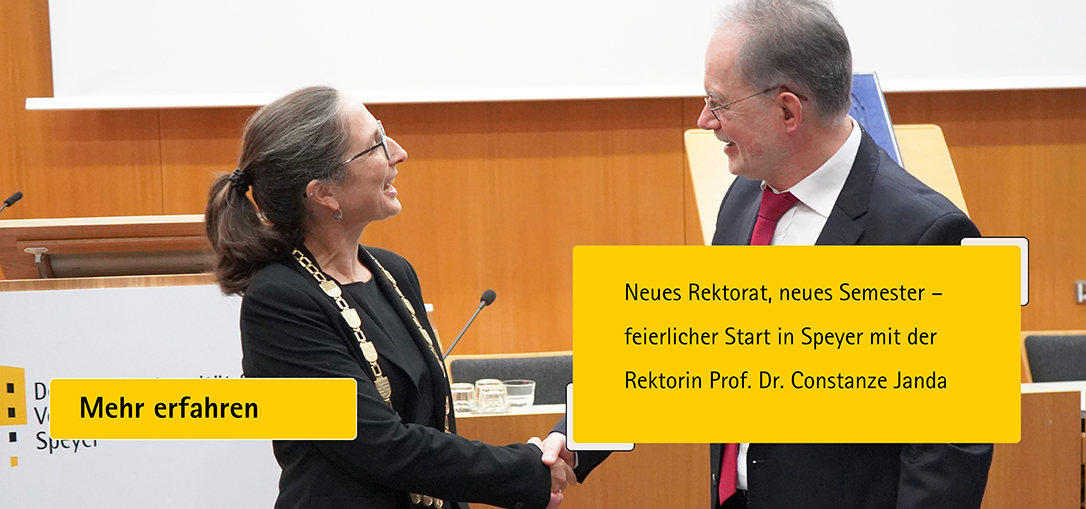 Am 3. November 2025 fand in der Aula der Universität Speyer die feierliche Rektoratsübergabe statt. Prof. Dr. Holger Mühlenkamp übergab das Amt an Prof. Dr. Constanze Janda, die mit einem Vortrag zur „Zukunft des Sozialstaats“ das neue Semester eröffnete.