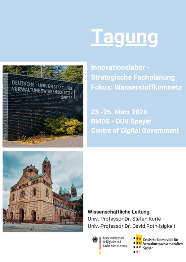 Vom 23. bis 26. März 2026 bietet die Deutsche Universität für Verwaltungswissenschaften Speyer unter der wissenschaftlichen Leitung von Univ.-Professor Dr. David Roth-Isigkeit und Univ.-Prof. Dr. Stefan Korte in Kooperation mit dem Bundesministerium für Digitalisierung und Staatsmodernisierung die zweite Auflage des Innovationslabors für Planungs- und Genehmigungsverfahren an. Der Fokus dieses Innovationslabors liegt diesmal wieder auf der strategischen Fachplanung des Wasserstoffkernnetzes.