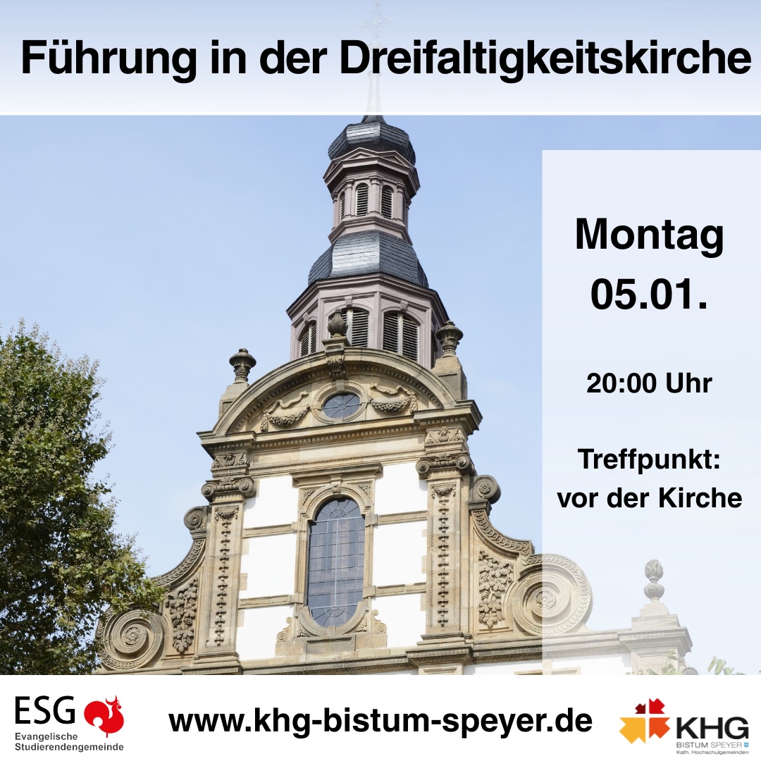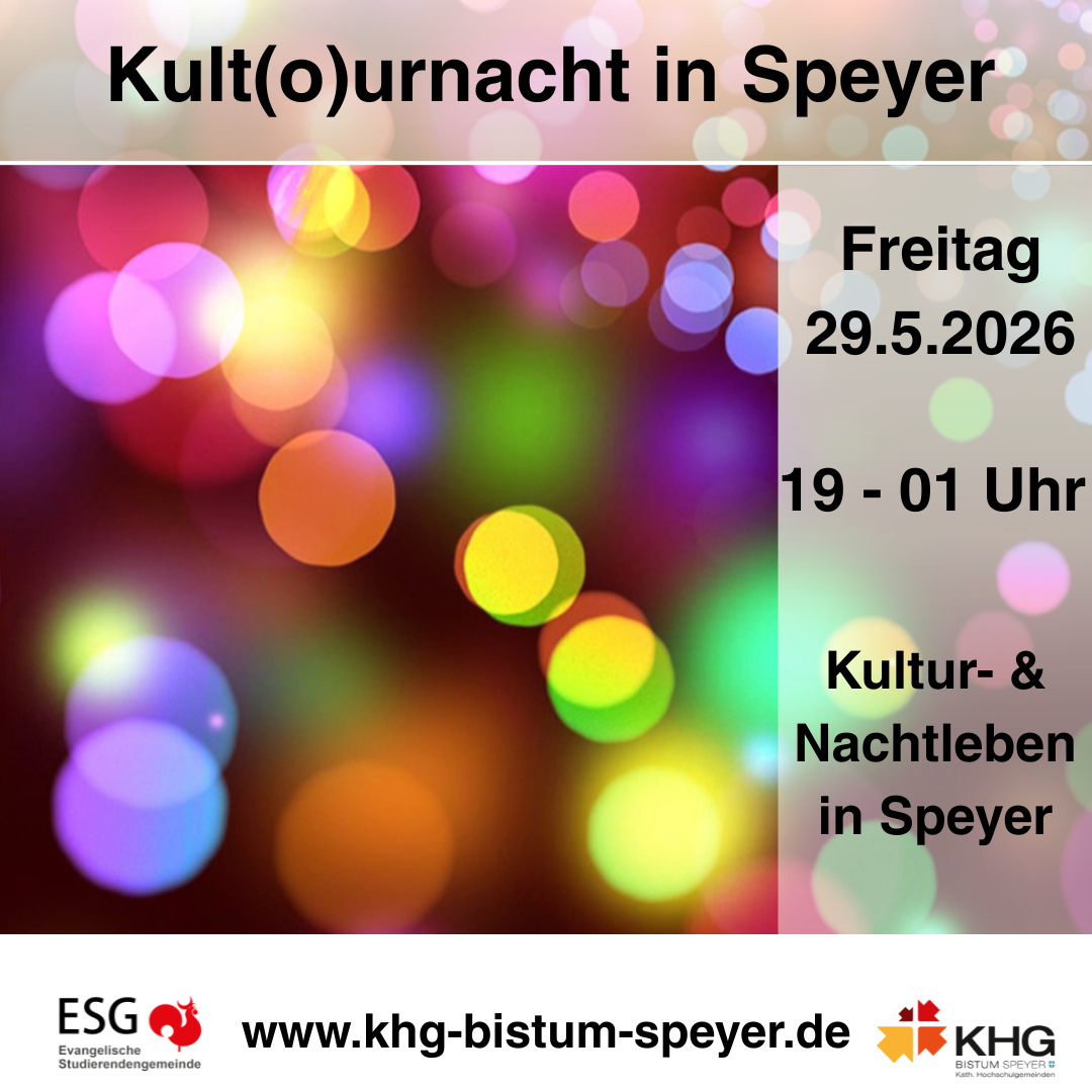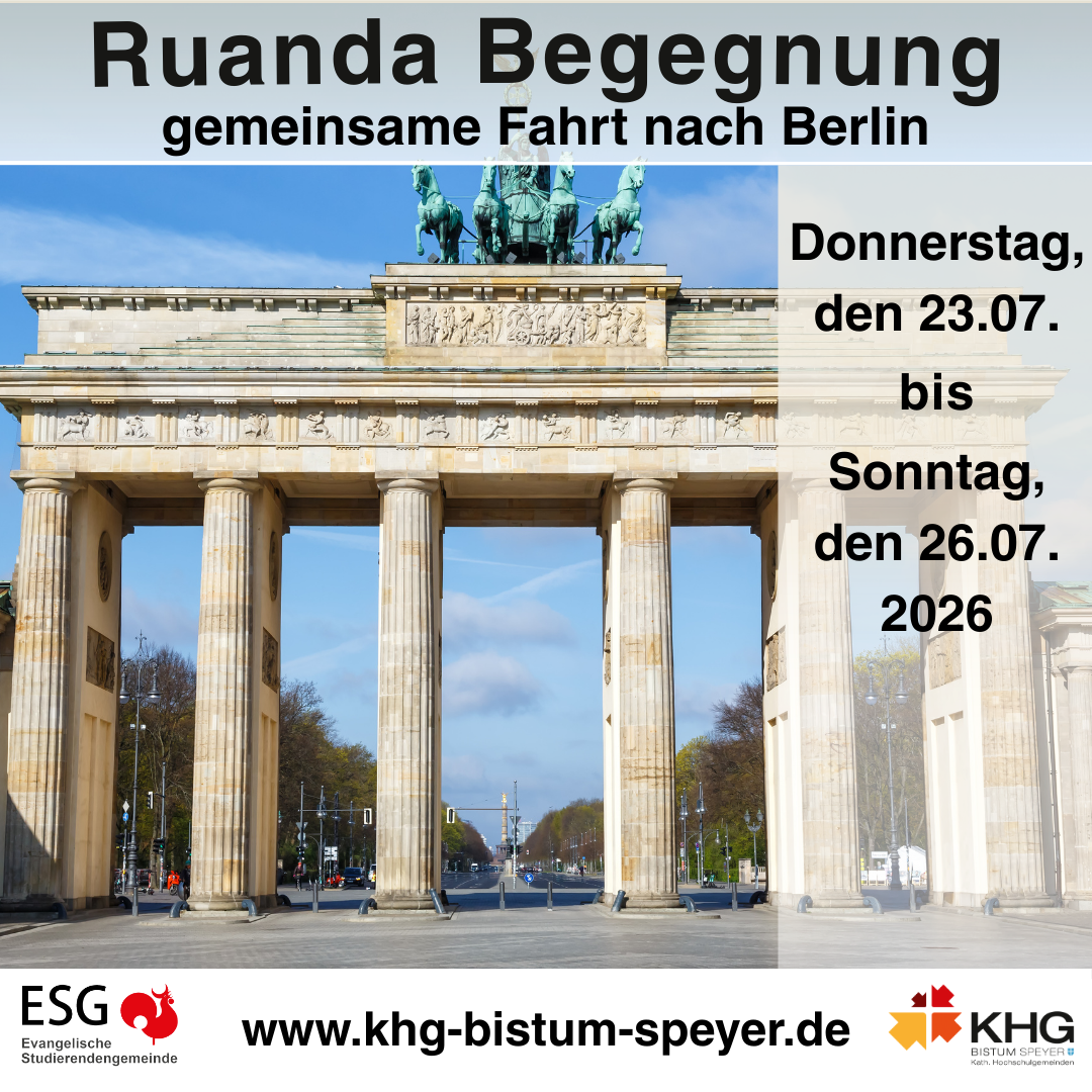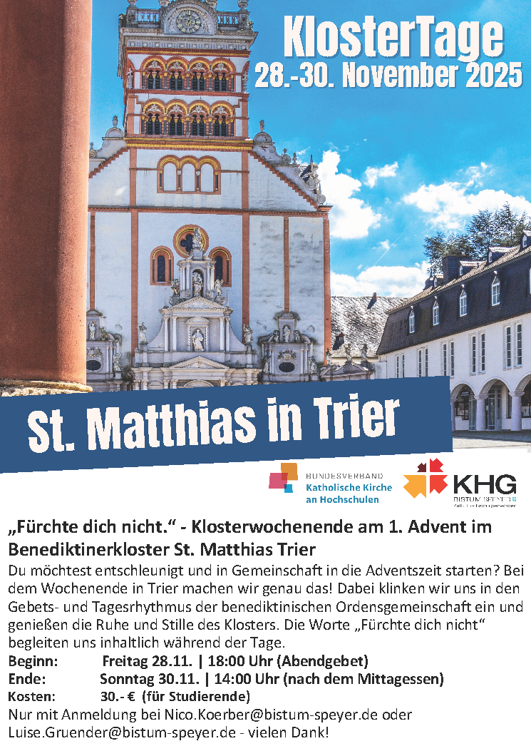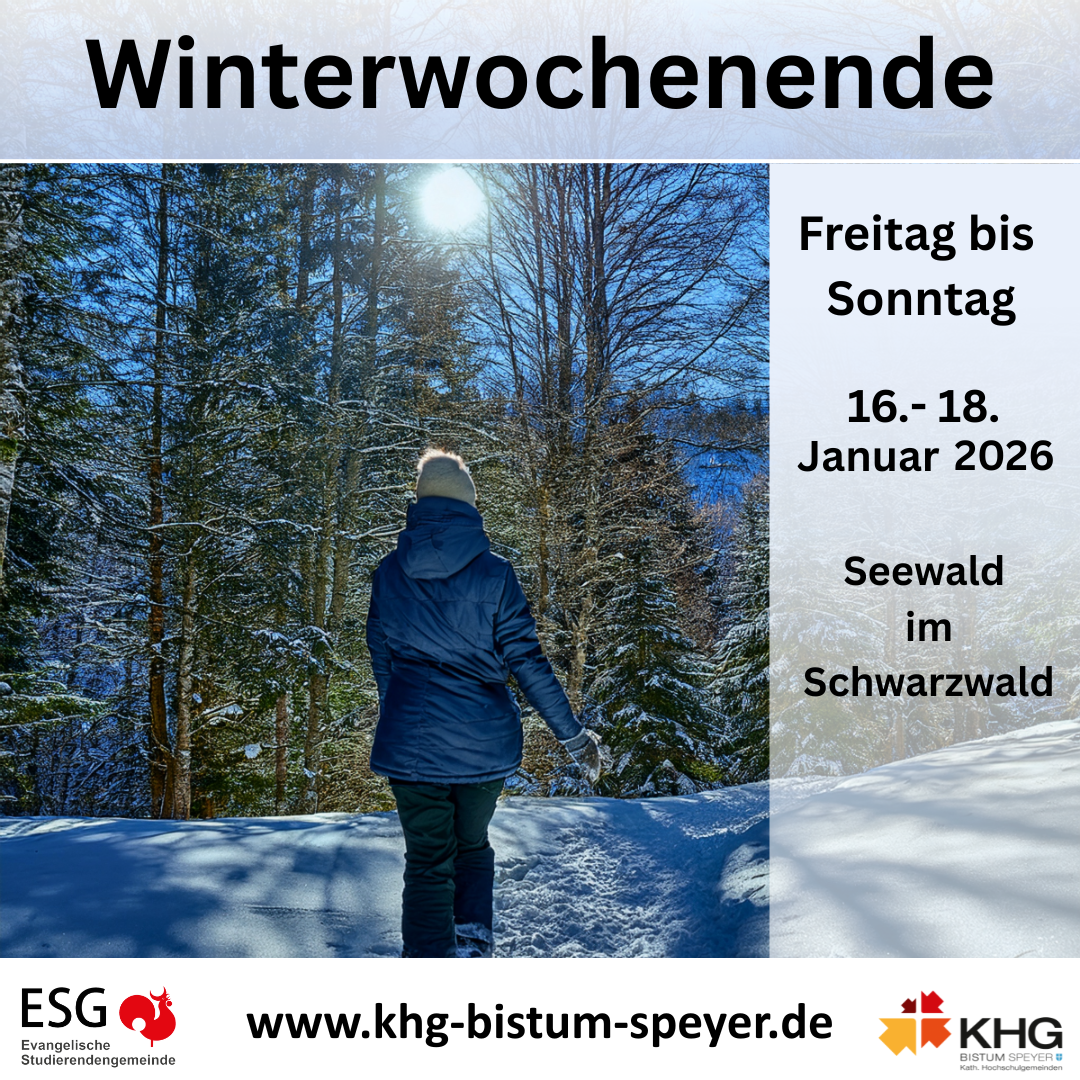 Die Katholische Hochschulgemeinde (KHG) und die Evangelische Studierendengemeinde (ESG) laden alle Studierenden (egal welcher Konfessionszugehörigkeit) zu ihrem gemeinsamen Programm ein: